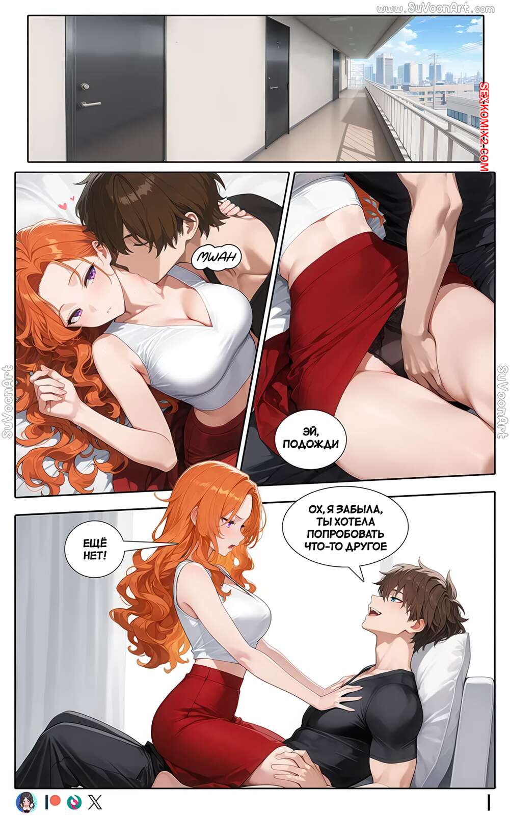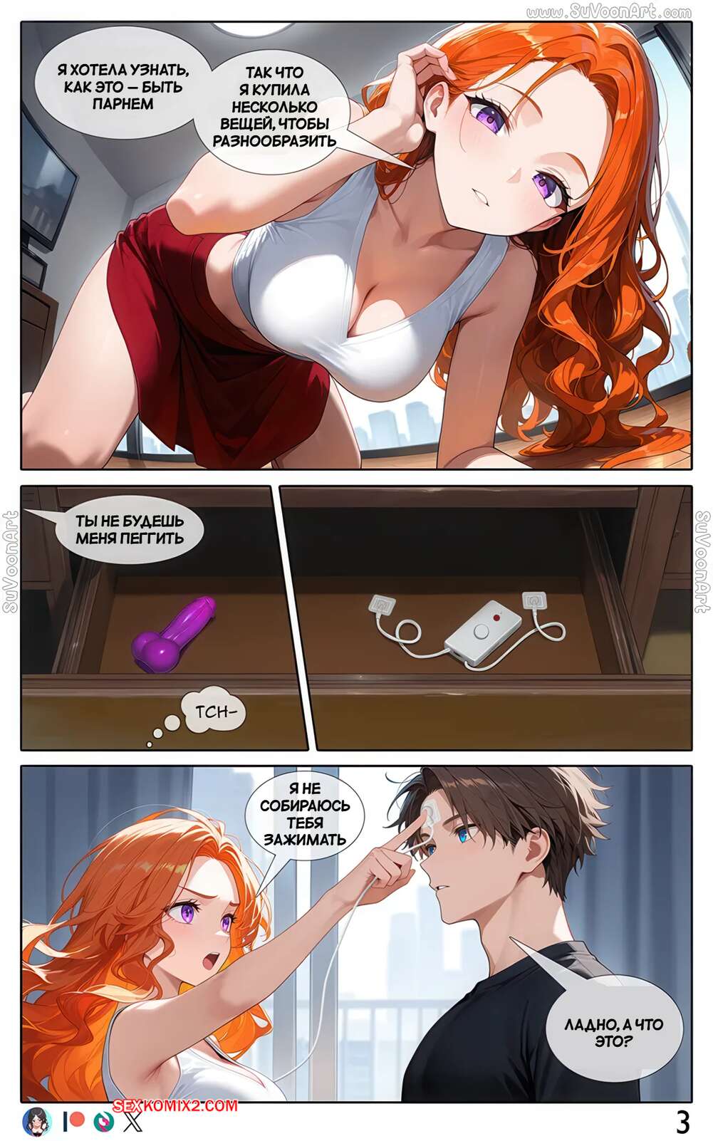 Порно комикс Другая сторона. Часть 1. The Other Side. SuVoonArt. Рыжая малышка заигрывает с парнем, желая пошалить, и дает ему пососать свои сиськи. Девушка легла на кровать и раздвинула ножки, позволив парню себя хорошенько выебать.