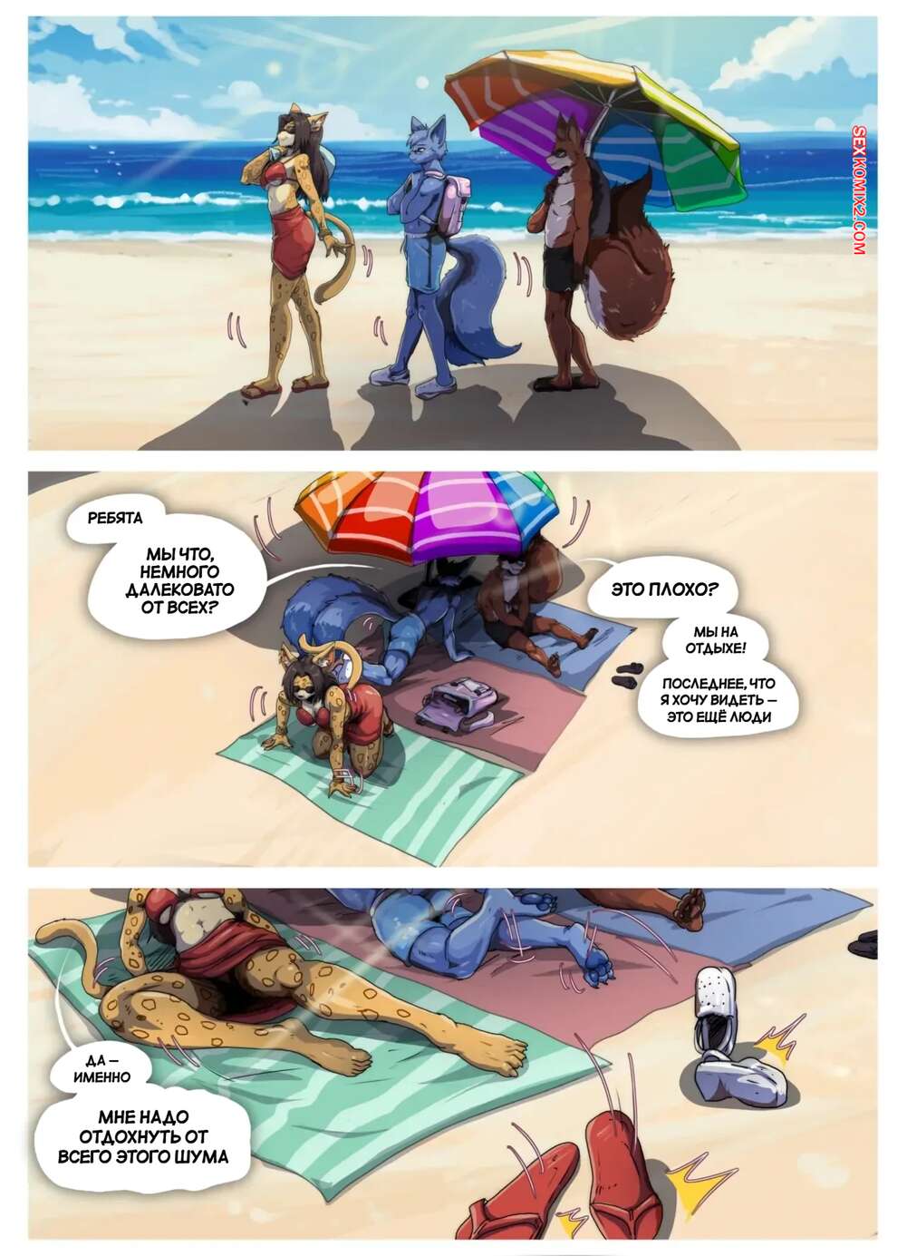 Порно комикс Летняя смелая игра. Summer Daring Game. Teastuff. Брюнетка фурри отправилась на пляж с двумя своими дружками, где предложила им поиграть. Красотка стала сосать большие члены парней, после чего они ее выебали в пизду и задницу.