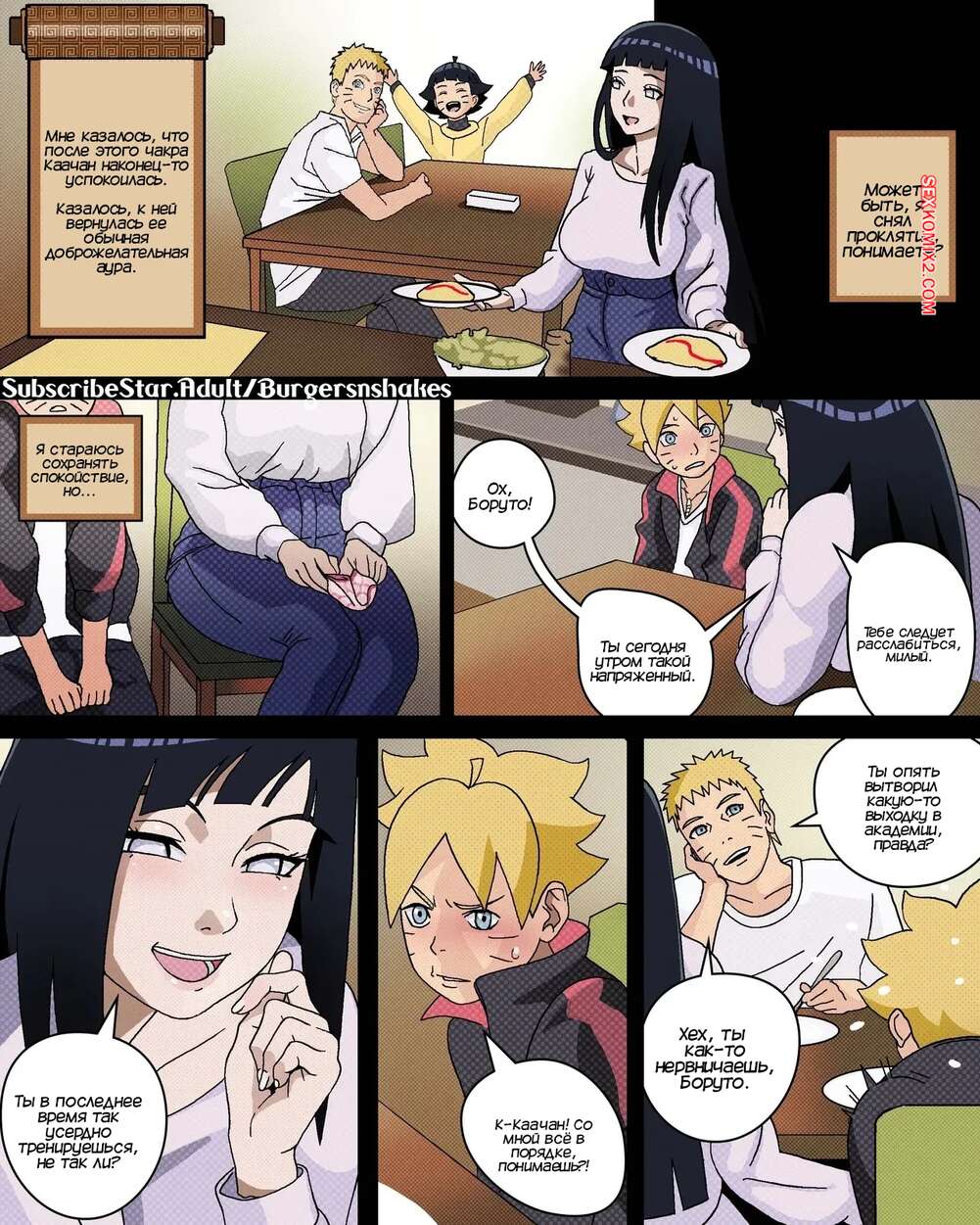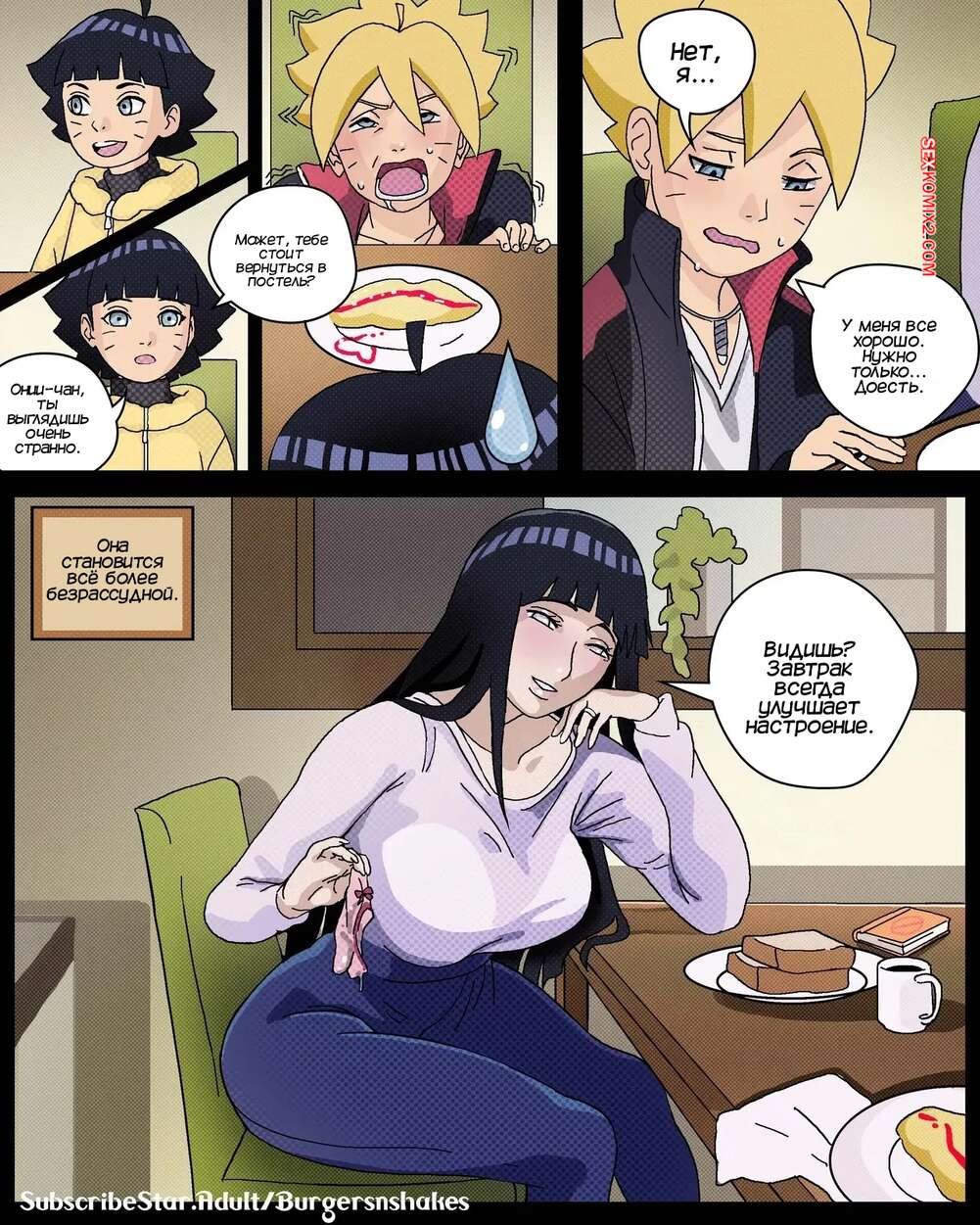 Порно комикс Наруто. Зависимость Хинаты возвращается. Часть 4. BurgersNShakez Боруто проснулся и обнаружил в своей постели горячую мамочку. Он стал переживать, что отец их спалит, но Хината стала рассказывать сыну о своем странном сне.