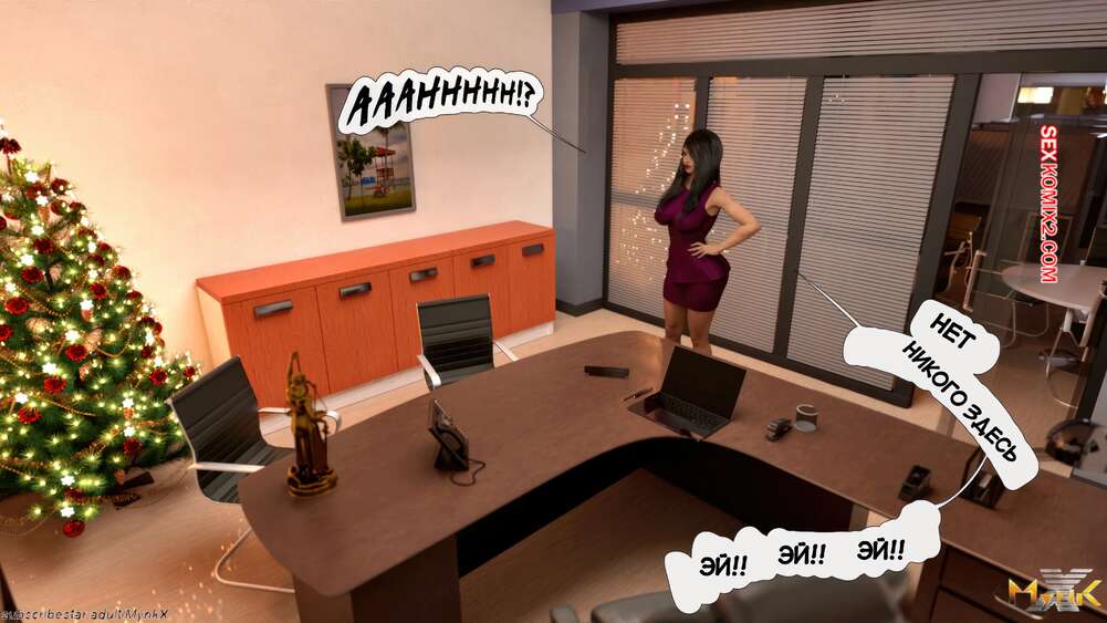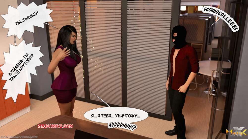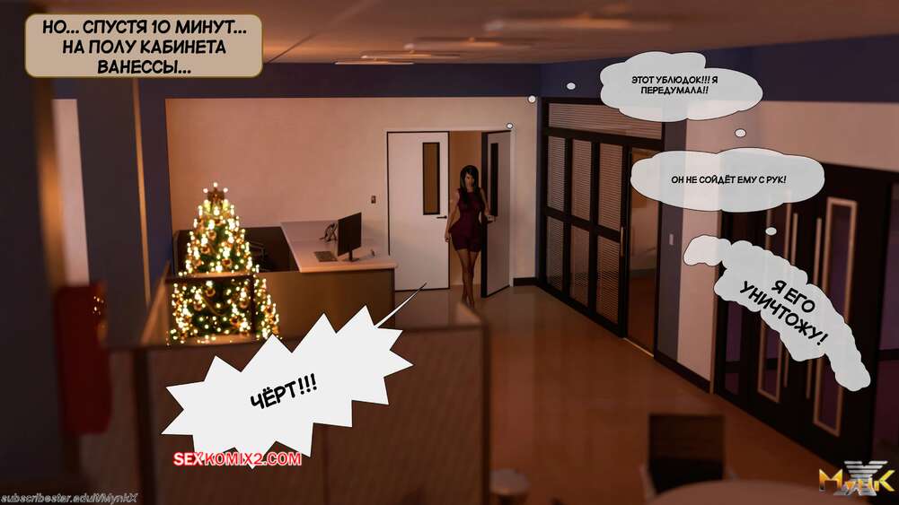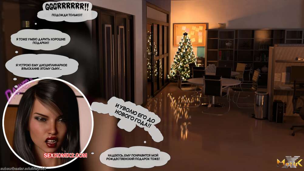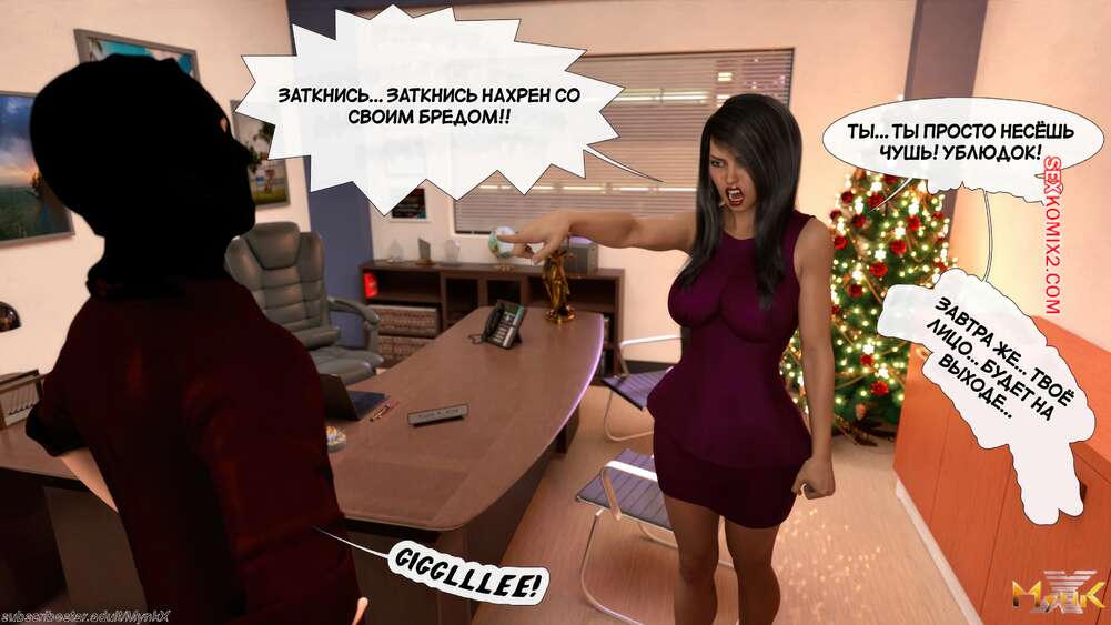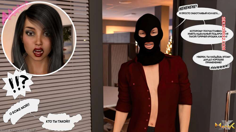 Порно комикс Развратное рождество. Часть 2. A Naughty Christmas. Mynkx Парень в маске ворвался в офис к горячей брюнетке и стал ее угрожать. Он достал член и поставил сучку на колени, чтобы она ему отсосала, после чего он выебал ее пизденку.