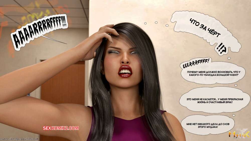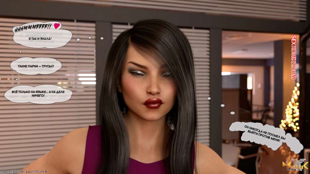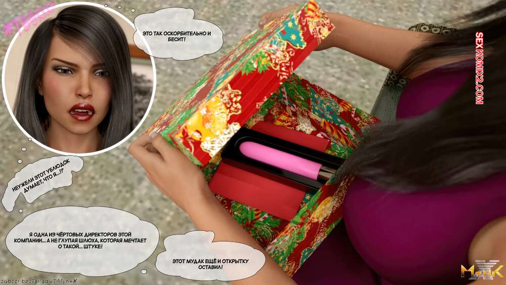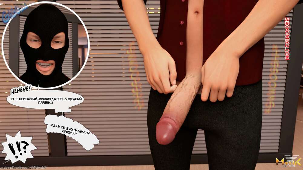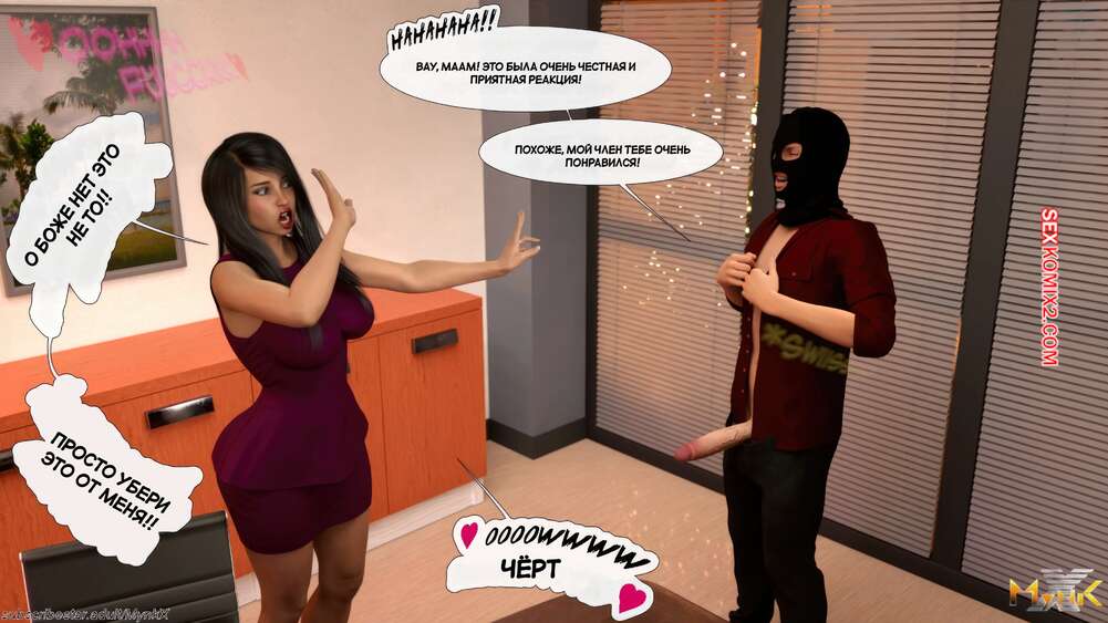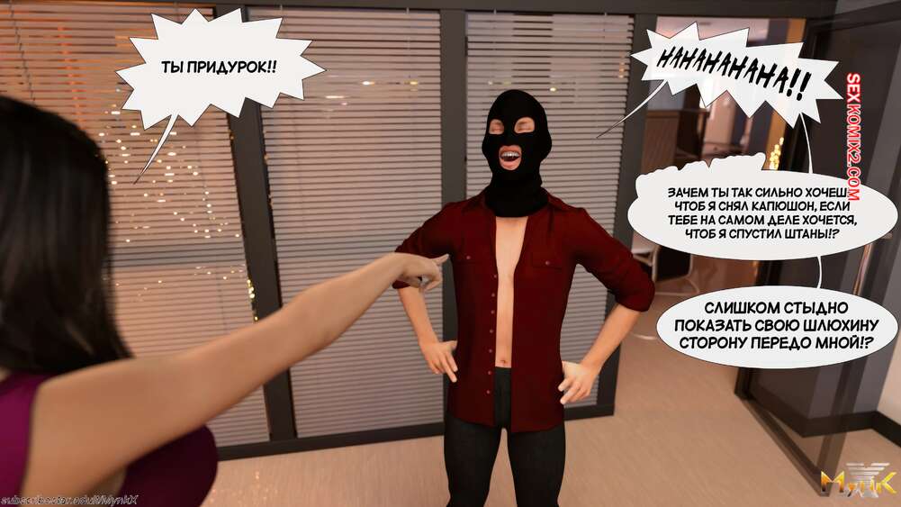 Порно комикс Развратное рождество. Часть 2. A Naughty Christmas. Mynkx Парень в маске ворвался в офис к горячей брюнетке и стал ее угрожать. Он достал член и поставил сучку на колени, чтобы она ему отсосала, после чего он выебал ее пизденку.